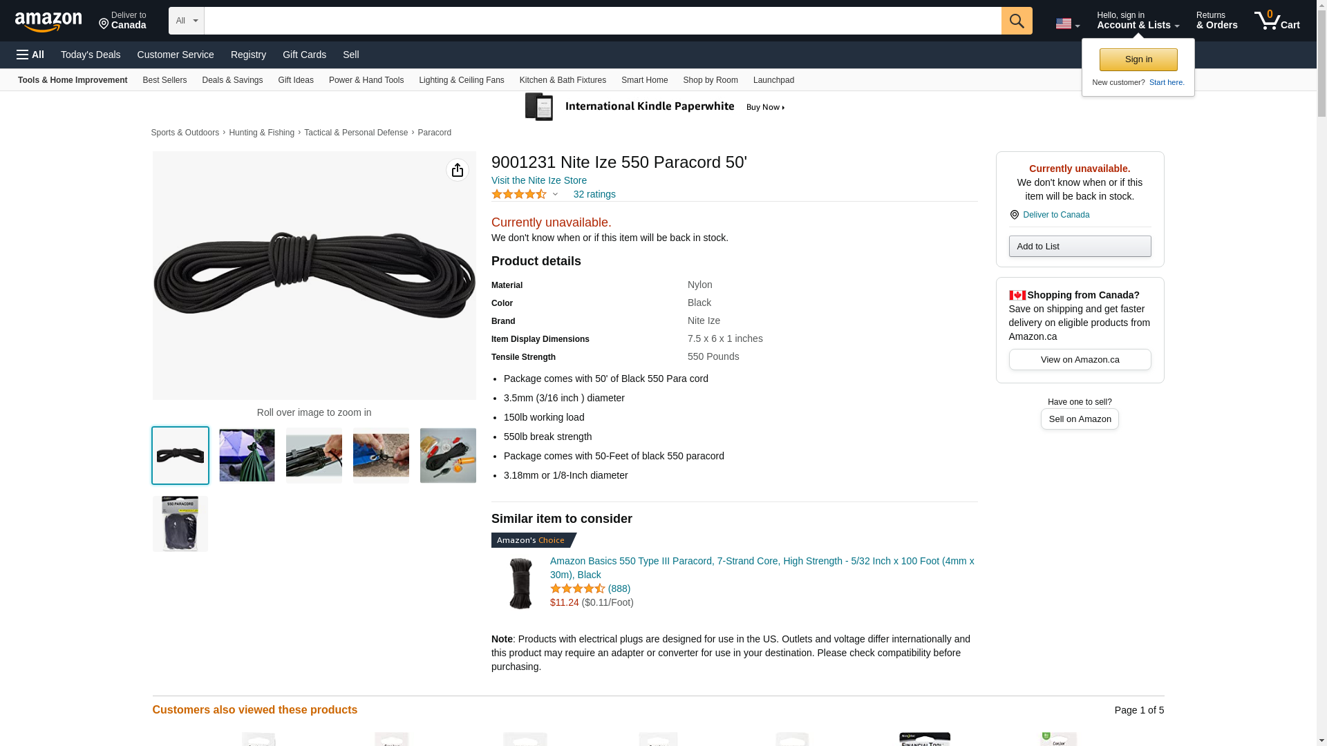 Originally created as suspension lines for parachutes, the lightweight, semi-elastic strength and weather-resistant quality of braided nylon paracord makes it a versatile, durable alternative to rope, with hundreds of uses. Tested for 550 pound break strength, the Nite Ize 550 paracord is excellent for bundling small loads and rucksacks, for use in harnesses, clothes line, dummy cords, guy lines, snare lines, hanging bear bags, for use as boot and shoe laces - any task where light cordage is needed. In a pinch, you can pull the guts from the outer case and use the inner strands for fishing line, zipper pulls - even dental floss. Features:- Package comes with 50' of black 550 paracord- 3/16" diameter- 150 lb. working load- 550 lb. break strengthWarning: This product is not designed to hold your body weight or to lift heavy objects overhead. Do not use this product for climbing, repelling, lifting heavy objects or other situations where personal safety or valuable property can be endangered. The working load and weight rating are based on static tests and the limits shown should never be exceeded. Shock conditions (swing, stress, jerk) can reduce working loads by more than 33%. Never stand in line with rope under tension such rope, particularly nylon rope, may recoil (snap back). Never use this product to secure large flat surfaces or objects. All ropes should be replaced if signs of wear, such as broken fibers are apparent. Knots reduce the strength of the rope more than 50%, splicing is preferable. Misuse can result in serious injury or no: PC550-04-50bar code: 094664023291manufacturer : Nite Izeshipping dimensions: weight: 0.3 dimensional weight: 5 (w) x1 (h) (d)