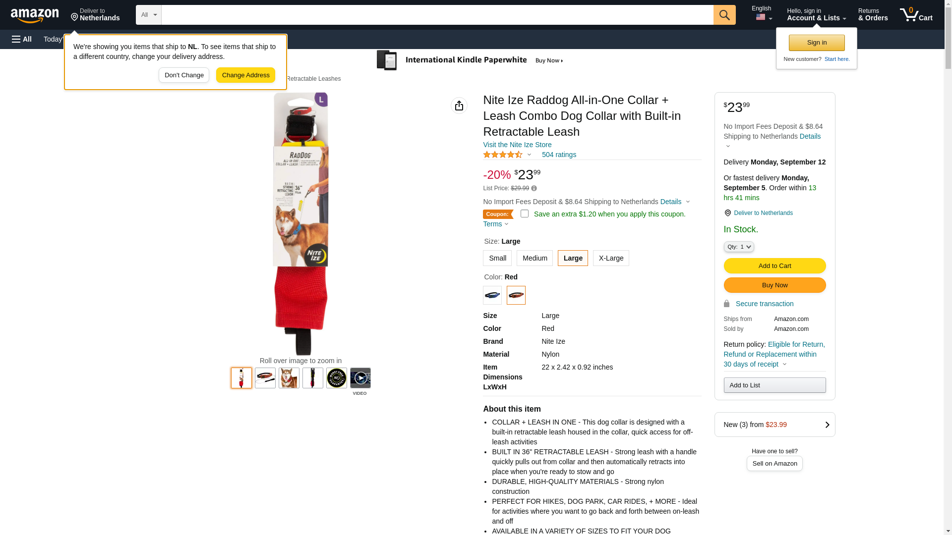 Nite Ize Raddog All-in-One Collar + Leash Combo, Dog Collar with Built-in Retractable Leash, Red, Large 16"-20"