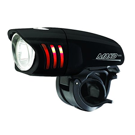 When the sun goes down and you're rushing across town to a friends house, the NiteRider Mako 200 Light will light the way for safe passage. Unlike most entry-level lights that're just bright enough to make the overly-cautious motorist aware of your presence, the Mako 200 light illuminates a visible path while adding to your safety. Using a Cree LED bulb, the Mako 200 light broadcasts a wide, 200 lumen beam across the road so you can avoid hitting fallen branches at full speed. With two steady light settings and a strobe setting, it's a breeze to dial in the best output level for your ride. And since lateral visibility is just as important as frontal visibility, NiteRider installed 'gills' on both sides of the light body to emit red light on every setting. The Mako also comes equipped with a handlebar mount that can accommodate bars up to 31. 8mm in diameter. The NiteRider Mako 200 Light comes with two AA batteries and weighs approximately 165g.