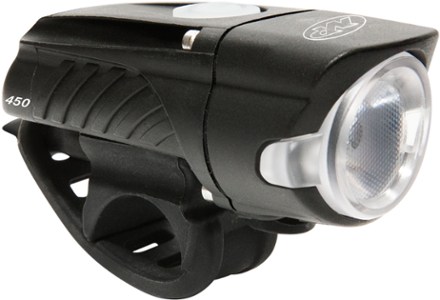 Delivering reliable performance in an ultra-compact headlight, the economical, USB-rechargeable NiteRider Swift 450 front bike light has a low-battery indicator and easy on/off handlebar strap mount.