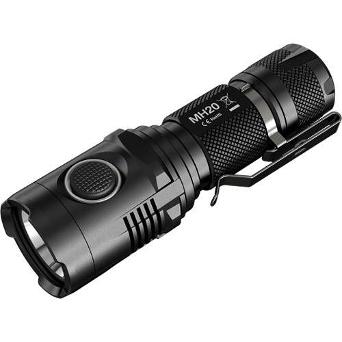 The NITECORE MH20 is the smallest 18650-powered, USB rechargeable flashlight available. Featuring a CREE XM-L2 US LED, the this super bright flashlight offers over 240 yards of throw. The convenient side switch memorizes the previously used settings and allows users to change the brightness level with a touch of button. Advanced temperature regulation technology allows the MH20 to dynamically adjust its output based upon the body temperature to extend its life span. A built-in USB charging port and included charging cable allows for easy charging at home and on the go. The MH20 uses 1x 18650 or 2x CR123A batteries (sold separetely). Included with the MH20 flashlight is a holster, charging cable, pocket clip, lanyard, spare USB port cover and spare O-ring.<br><br><b>Specifications:</b><br>* LED: CREE XM-L2 U2 </br>* Maximum Brightness: 1000 lumens</br>* Peak Beam Distance: 240 yards</br>* Peak Beam Intensity: 12500 cd</br>* IP Rating: IPX8 - 2m waterproof and submersible </br>* Impact Resistance: 1 m</br>* Brightness & Runtimes:<br>++++ Turbo: 1000 lumens / 2 hr<br>++++ High: 410 lumens / 2 hr 45 min<br>++++ Mid: 230 lumens / 5 hr 45 min<br>++++ Low: 50 lumens / 15 hr 45 min<br>++++ Ultralow: 1 lumen / 235 hr<br>++++ Strobe: 1000 lumens / --<br>++++ SOS: 1000 lumens / --<br>++++ Beacon: 1000 lumens / --<br>* Dimensions: L-4.13"xW-1.25"xH-1.25"<br>* Weight: 3.07oz<br><br>