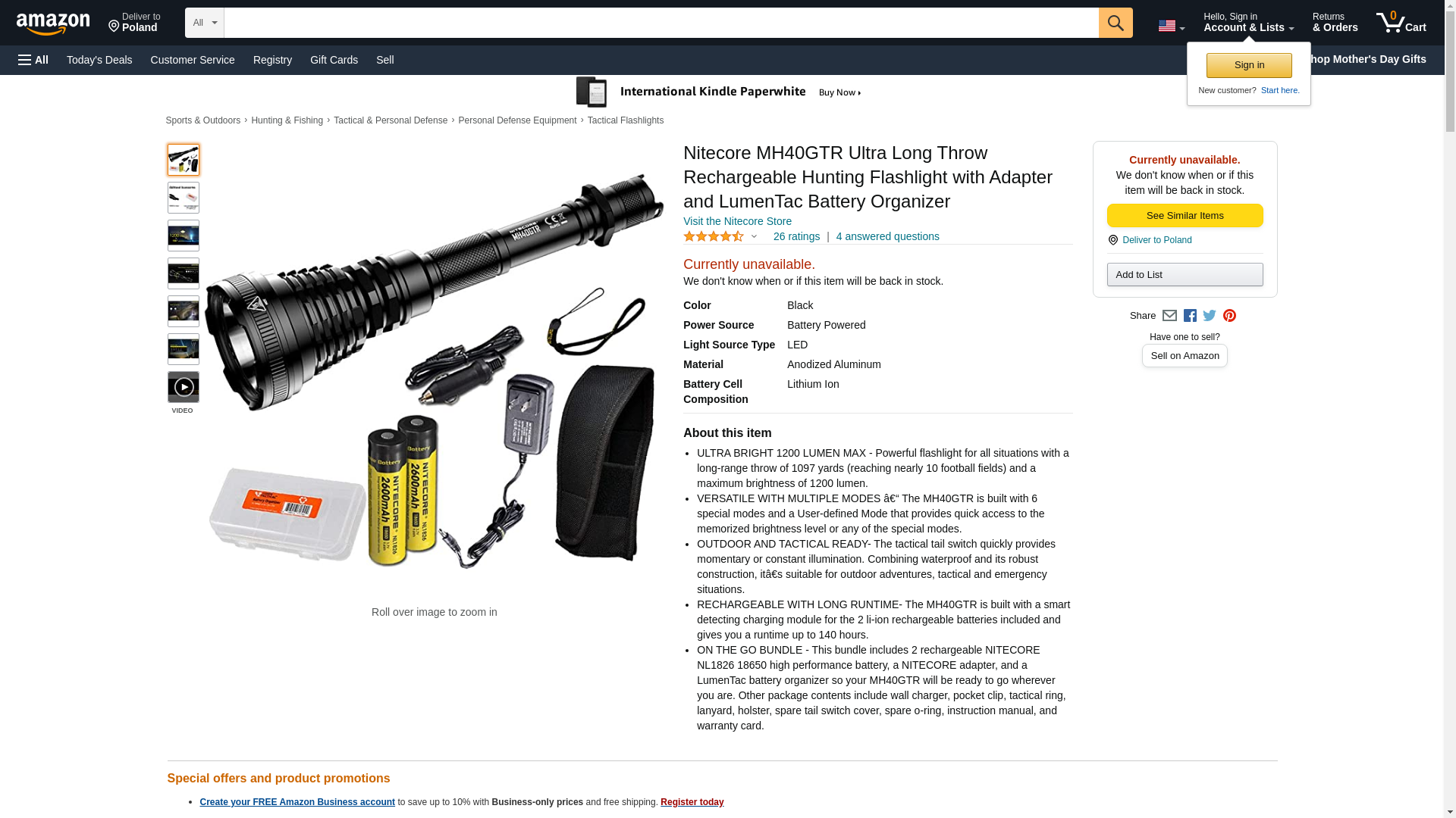 With a maximum brightness of 1200 lumens, the NITECORE MH40GTR has an ultra-long-range throw of 1004 yards, reaching nearly 10 football fields. The MH40GTR is equipped with a premium CREE XP-L HI V3 LED puts out six light modes (Turbo, High, Mid, Low, Strobe, SOS) which are essential for any outdoor adventure or tactical situation you may encounter. In addition, the MH40GTR's aerospace-grade aluminum alloy construction and port cover makes this flashlight waterproof so it can be used in all weather conditions.<br><br>Designed specifically for tactical and outdoor usage. The MH40GTR is easy to operate with a tactical tail switch that allows momentary or constant illumination. Switch light modes quickly by twisting the flashlight head from User-defined Mode to Turbo. Whether, youâ€re capturing prey with Turbo + High mode or seizing the moment to blind your enemy with Turbo+ Strobe. The MH40GTR provides you with all the light modes for any scenario. <br><br><b>Specifications:</b><br>* LED: CREE XP-L HI V3 </br>* Maximum Brightness: 1200 lumens</br>* Peak Beam Distance: 1097 yards</br>* Peak Beam Intensity: 252000 cd</br>* IP Rating: IPX8 - 2m waterproof and submersible </br>* Impact Resistance: 1 m</br>* Brightness & Runtimes:<br>++++ Turbo: 1200 lumens / 2 hr<br>++++ High: 380 lumens / 6 hr 15 min<br>++++ Mid: 100 lumens / 27 hr <br>++++ Low: 15 lumens / 140 hr<br>++++ Strobe: 1200 lumens / --<br>++++ SOS: 1200 lumens / --<br>* Dimensions: L-10.11"xW-2.75"xH-2.75"<br>* Weight: 13.19oz<br><br>