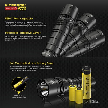 - USB-C RECHARGEABLE - The P22R runs on an included 3500mAh 18650 (NL1835HP) battery that can be quickly charged with the USB-C charging cable. The light is also compatible with CR123/RCR123s.