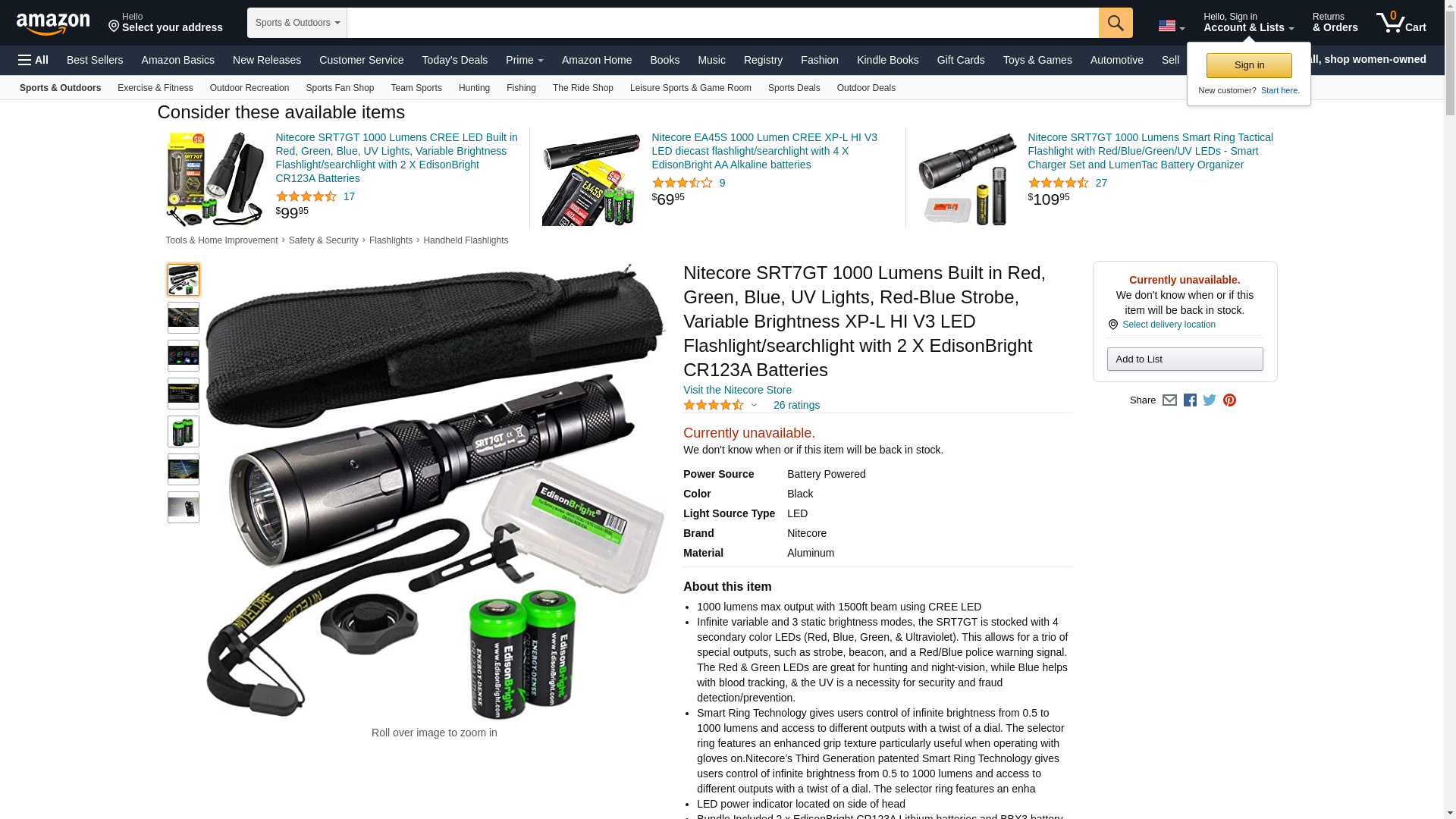 Nitecore SRT7 features industry-leading third generation Smart Selector Ring Technology, provides you a smooth and rapidly infinitely variable brightness adjustment from 0 to 960 lumens.<br><br> The revolutionary built-in Red, Green and Blue LED's offers the unique tactical versatility. <br><br> <b>Features:<b> <br>Purpose-designed for law enforcement, hunting and tactical applications. <br>The world’s first line of flashlights to feature third generation SSR (smart selector ring) technology <br>Smoothly and rapidly select brightness levels and function by rotating a smart selector ring <br>Utilizes the latest CREE XM-L (XM-L2 T6) LED for a maximum output of up to 960 lumens <br>Second generation of ‘Crystal Coating Technology’ along with ‘Precision Digital Optics Technology’ provide extreme reflector performance <br>Boasts a peak beam intensity of 23,256cd and a throw distance of up to 308 meters (ANSI FL1) <br>High efficiency circuit board provides up to 200 hours runtime on lowest output level <br>Equipped with unique multi-colored (red, green and blue) tactical / signaling lights <br>Infinite brightness adjustment from 0 to 960 lumens <br>Six rapidly switchable functions to select from <br>Multi-functional power indicator light displays low battery status <br>Patented spring-loaded impact absorption mechanism with reverse polarity protection <br>Stainless steel titanium-plated two-way clip <br>Stainless steel retaining ring protects core components from damage <br>Toughened ultra-clear mineral glass with anti-reflective coating <br>Constructed from aero grade aluminum alloy <br>Robust HAIII military grade hard-anodized <br>Waterproof in accordance with IPX-8 (two meters submersible) <br>Impact resistant to 1.5 meters <br>Tail stand capability <br><br> Battery is not included