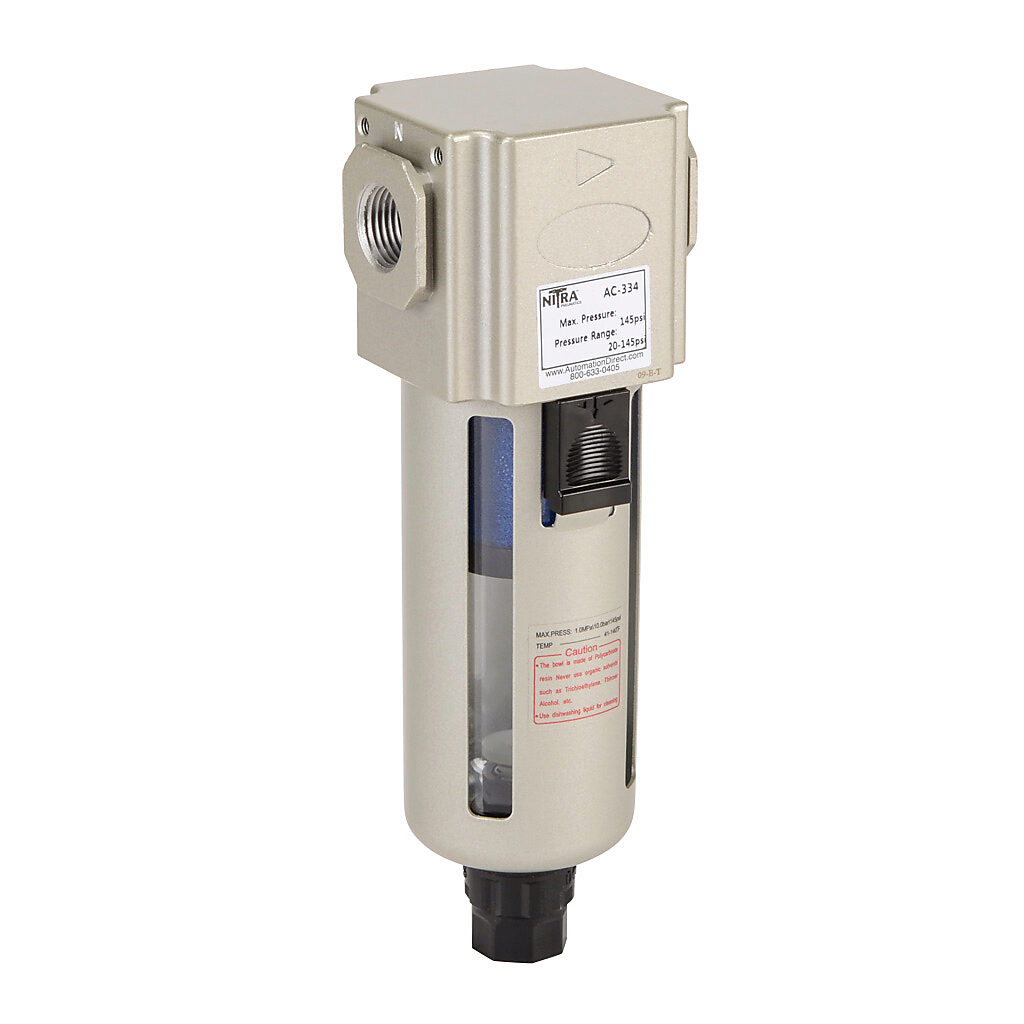 AC-334 - NITRA pneumatic filter, coalescing, 3/8in female NPT inlet(s), 3/8in female NPT outlet(s), manual/semi-automatic drain, polycarbonate bowl, metal...