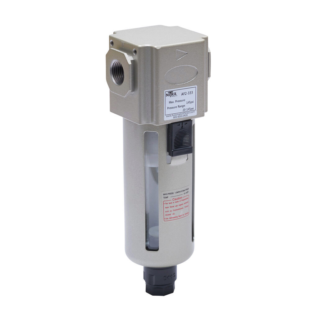 AF2-333 - NITRA pneumatic filter, particulate and moisture separation, 3/8in female NPT inlet(s), 3/8in female NPT outlet(s), manual/semi-automatic drain,...