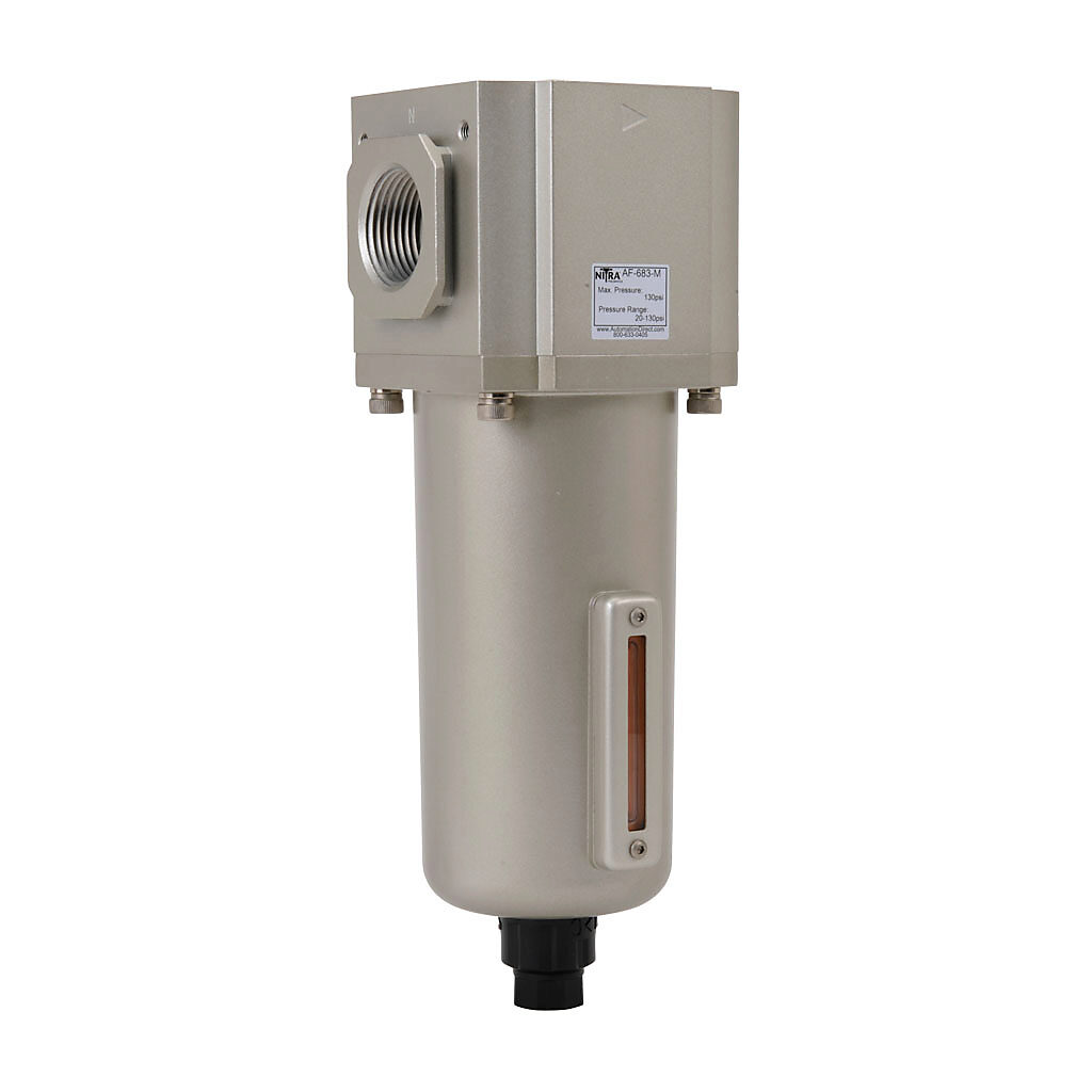 AF-683-M - NITRA pneumatic filter, particulate and moisture separation, 1in female NPT inlet(s), 1in female NPT outlet(s), manual drain, die-cast aluminum...