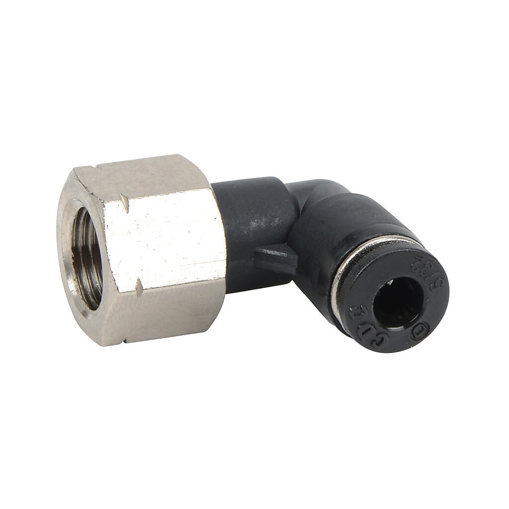 FE532-18N - NITRA pneumatic push-to-connect fitting, female, elbow, rotating, thermoplastic (PBT) body, nickel-plated brass threads, 5/32in (4mm) tube to...