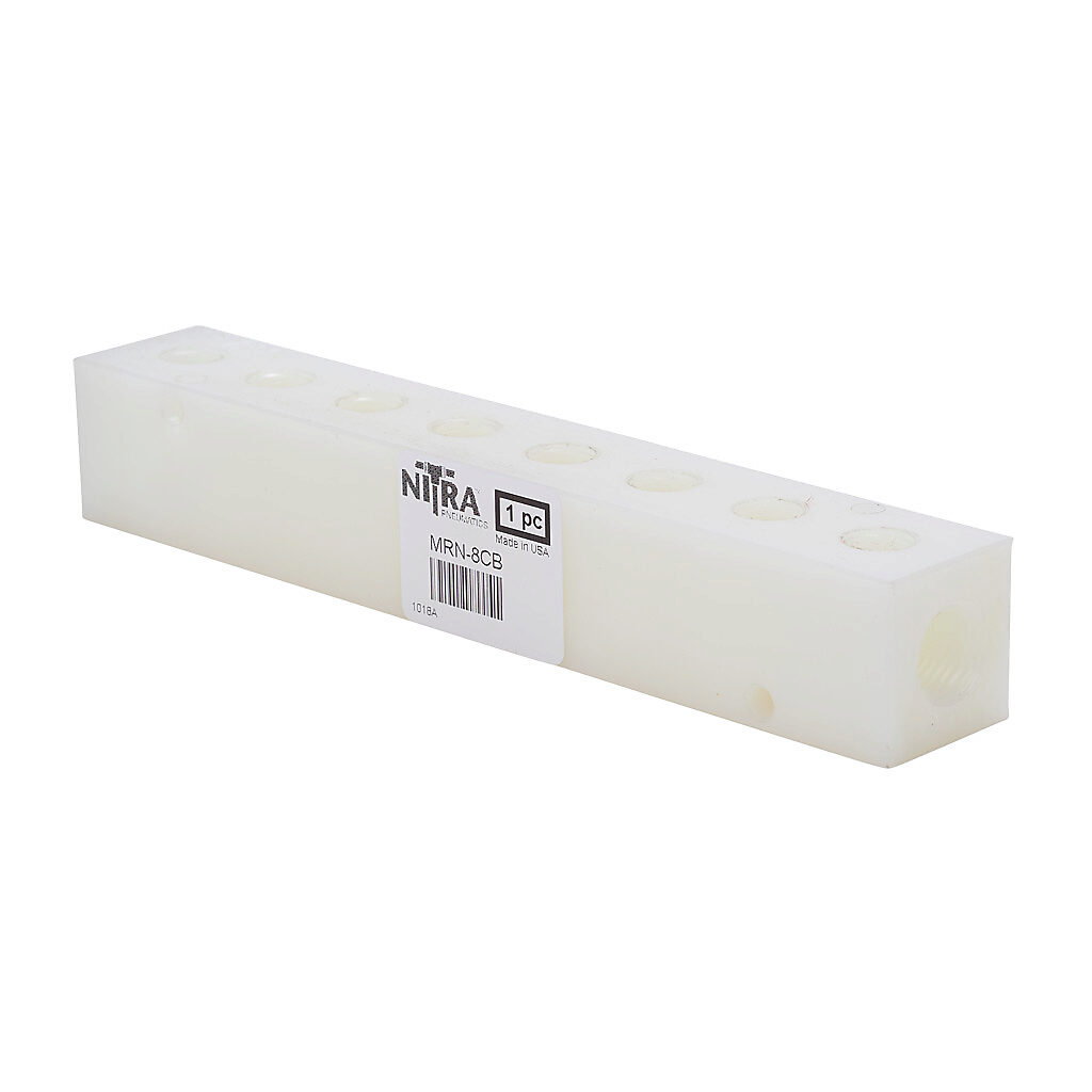MRN-8CB - NITRA pneumatic or water valve manifold, Nylon 6, rectangular, 200 psi maximum operating pressure, (8) stations, (2) 1/4in female NPT inlet(s),...