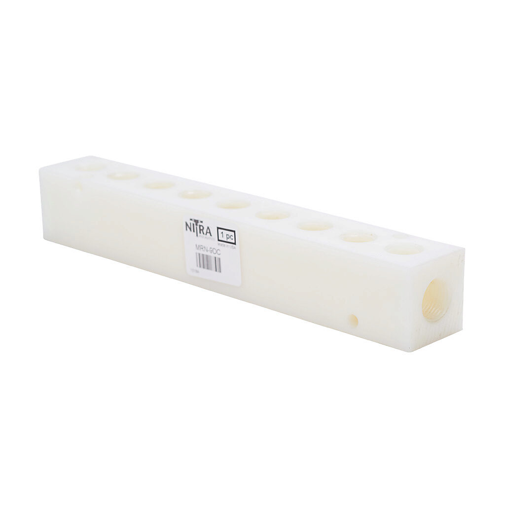 MRN-9DC - NITRA pneumatic or water valve manifold, Nylon 6, rectangular, 200 psi maximum operating pressure, (9) stations, (2) 3/8in female NPT inlet(s),...
