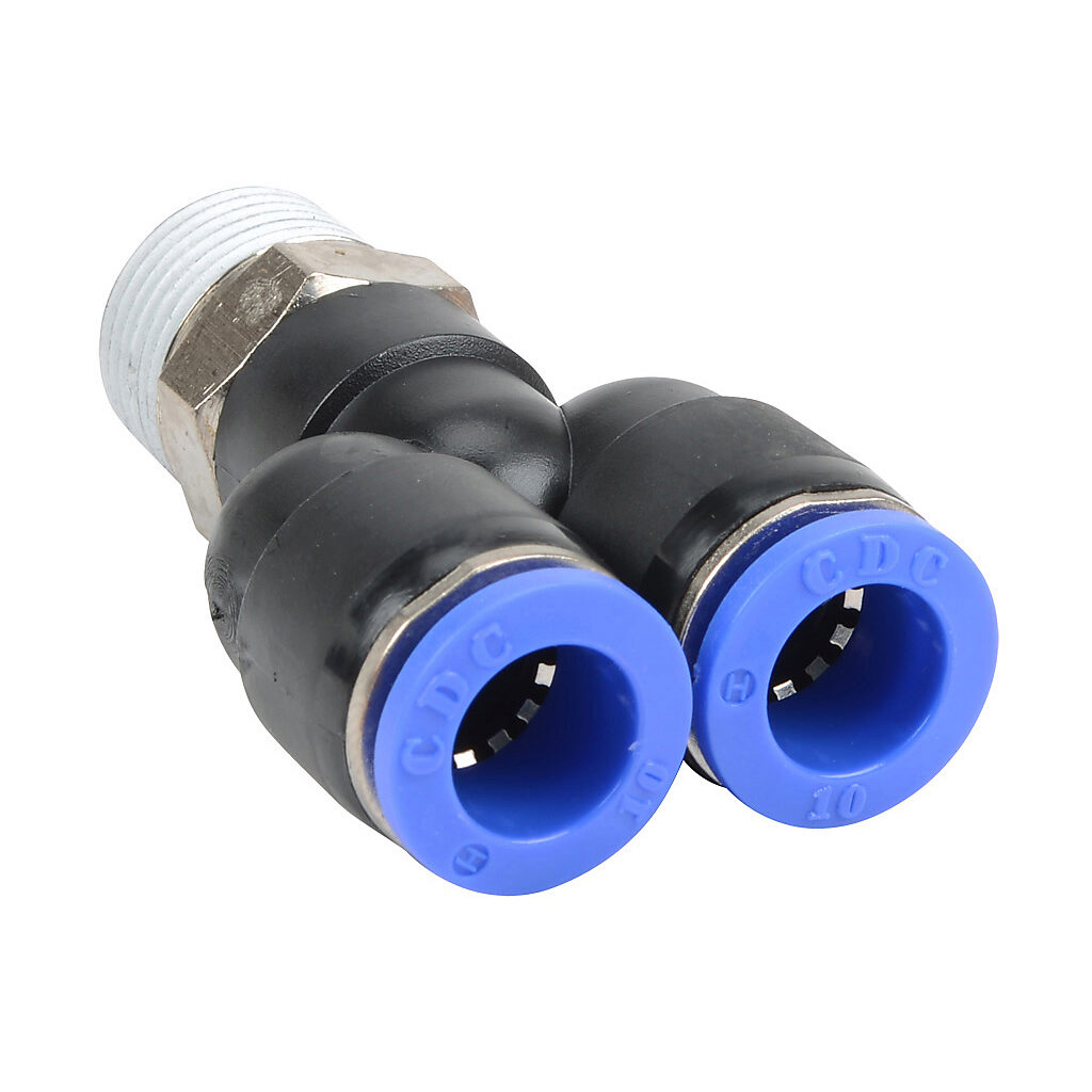 MY10M-38R - NITRA pneumatic push-to-connect fitting, male, Y, rotating, thermoplastic (PBT) body, nickel-plated brass threads, (2) 10mm tube to R3/8 BSPT...