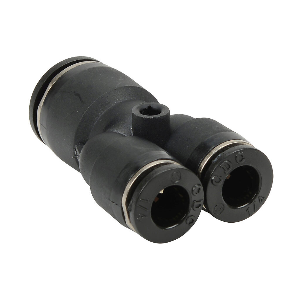 URY38-14 - NITRA pneumatic push-to-connect fitting, union Y reducer, thermoplastic (PBT) body, 3/8in tube to (2) 1/4in tube connection(s). Package of 5.