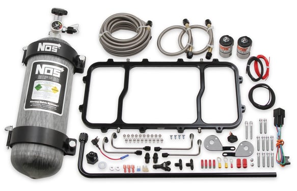 1-Piece Black Billet Aluminum Nitrous Plate System with 12 lb Carbon Fiber Bottle;<br><br>NOS sandwich-style plate systems are designed to bolt between the upper and lower intake sections on Holley Hi-Ram LS manifolds. Our dry NOS systems give you everything you need including 2 NOS Pro-Race NOS solenoids, brackets, hoses, jetting, and hardware, along with your choice of NOS bottle. At the center of this system is our machined billet 6061-T6 aluminum plate laser engraved with NOS logo, then anodized for great looks and excellent corrosion protection. Our 1-piece plate features machined passages that precisely spray into the center of each cylinder. Plate includes jetting for up to 250 horsepower but is capable of supporting 1000+ horsepower. The plate is made from billet aluminum with passages machined directly into the plate so there is no need to worry about spray bars breaking or spinning.;