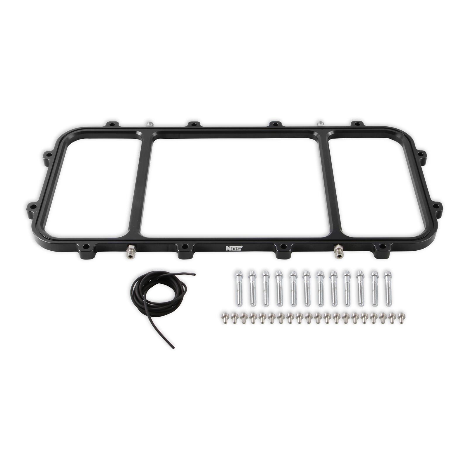 One-Piece Billet Aluminum Dry NOS Plate with Black Anodized Finish;Dry Single Stage NOS Plate Sandwiches Between the Bottom Base and Top Plate on Holley Hi-Ram Intake Manifolds; Fits Holley Gen-V LT Hi-Ram Intake Manifolds; Designed for Optimum NOS Distribution on LT Hi-Ram; Sprays NOS Directly into Each Intake Runner ; Features Machined 0.103” Passage that Feeds Eight 0.040” Openings per Intake Runner; Plate is Made from Billet 6061-T6 Aluminum and has Laser Etched NOS Logo; Choose from Clear or Black Anodized Finish – for Corrosion Resistance & Appearance; Includes Jetting for 50, 100, 150, 200, and 250 Horsepower Configurations; Supports up to 1,000+ Horsepower (with Jets Purchased Separately); Includes Plate, Gasket, Hardware, Jet Holders, and Jetting for up to 250 Horsepower;