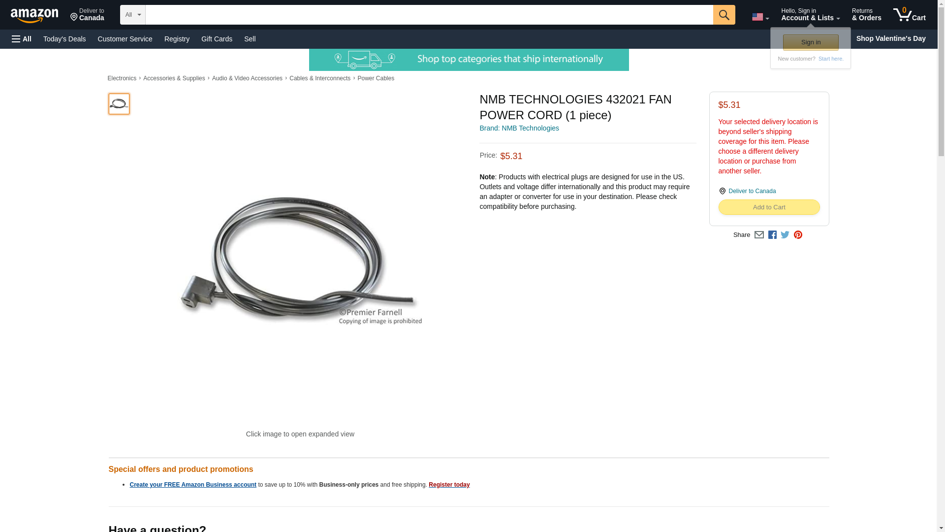 - Price For: Each For Use With: NMB Axial Fans Fan Side Connector: Right Angle Plug Cable Length: 36" Accessory Type: Fan Power Cord Equipment Side Connector: Blunt Cut Wire Leads Supply Voltage: 125V RoHS Compliant: Yes