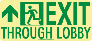 - Safety Signage: this sign is designed to instruct people to exit a facility through its lobby. It is often used to clearly communicate emergency exit procedure in commercial and public buildings