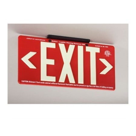 - Eco Exit Sign: this plastic exit sign uses photoluminescent technology to absorb and store ambient light and does not require wiring or battery replacement. This stored energy is used during blackout or smoky conditions to make the sign clearly visible