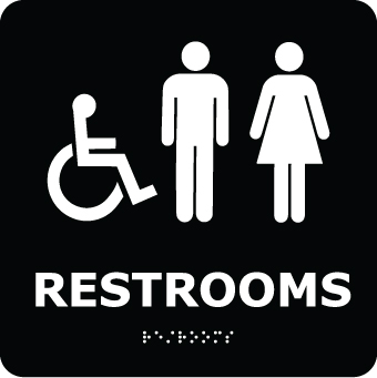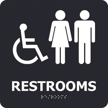 NMC ADA9WBK RESTROOMS Braille ADA Sign - 8 in. Square Sign - Plastic Sign with Handicap Symbol, Man, Woman Graphic, White Text on Black Base