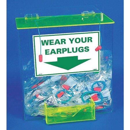 <p><strong>Features:</strong></p><ul><li>Draw attention with safety green front pocket and top</li><li>Table or wall mount</li><li>Large (13" x 12" x 8") holds 200 pairs</li></ul>