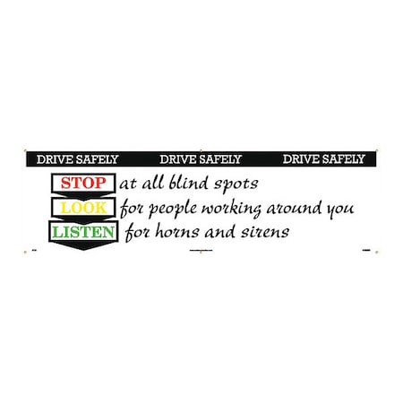 NMC BT22 Motivational and Safety Banner, Legend "DRIVE SAFELY - STOP, LOOK, LISTEN", 120" Length x 36" Height, Vinyl, Red/Yellow/Green/Black on White