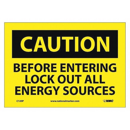 NMC C120P OSHA Sign, Legend "CAUTION - BEFORE ENTERING LOCK OUT ALL ENERGY SOURCES", 10" Length x 7" Height, Pressure Sensitive Vinyl, Black on Yellow