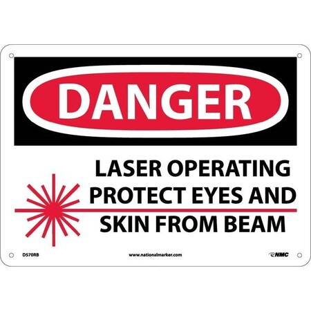 NMC D570RB OSHA Sign, Legend "DANGER - LASER OPERATING PROTECT EYES AND SKIN FROM BEAM" with Graphic, 14" Length x 10" Height, Rigid Plastic, Black/Red on White