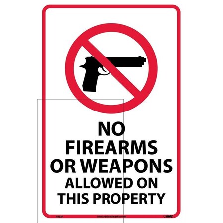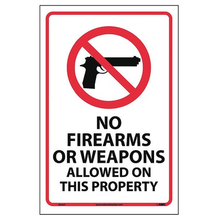 NMC M452P Security Sign, Legend "NO FIREARMS OR WEAPONS ALLOWED ON THIS PROPERTY", 12" Length x 18" Height, Pressure Sensitive Vinyl, Red/Black on White