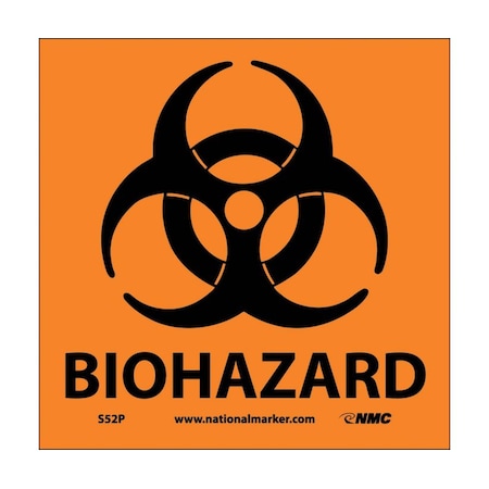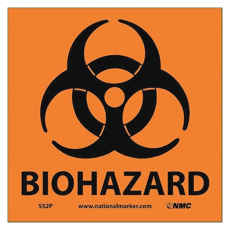 NMC S52P Warning Sign with Graphic, "BIOHAZARD", 7" Width x 7" Height, Pressure Sensitive Vinyl, Black on Orange