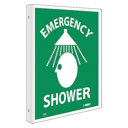 NMC TV3 Flanged Sign, Legend "EMERGENCY SHOWER" with Graphic, 8" Length x 10" Height, Rigid Plastic , White on Green