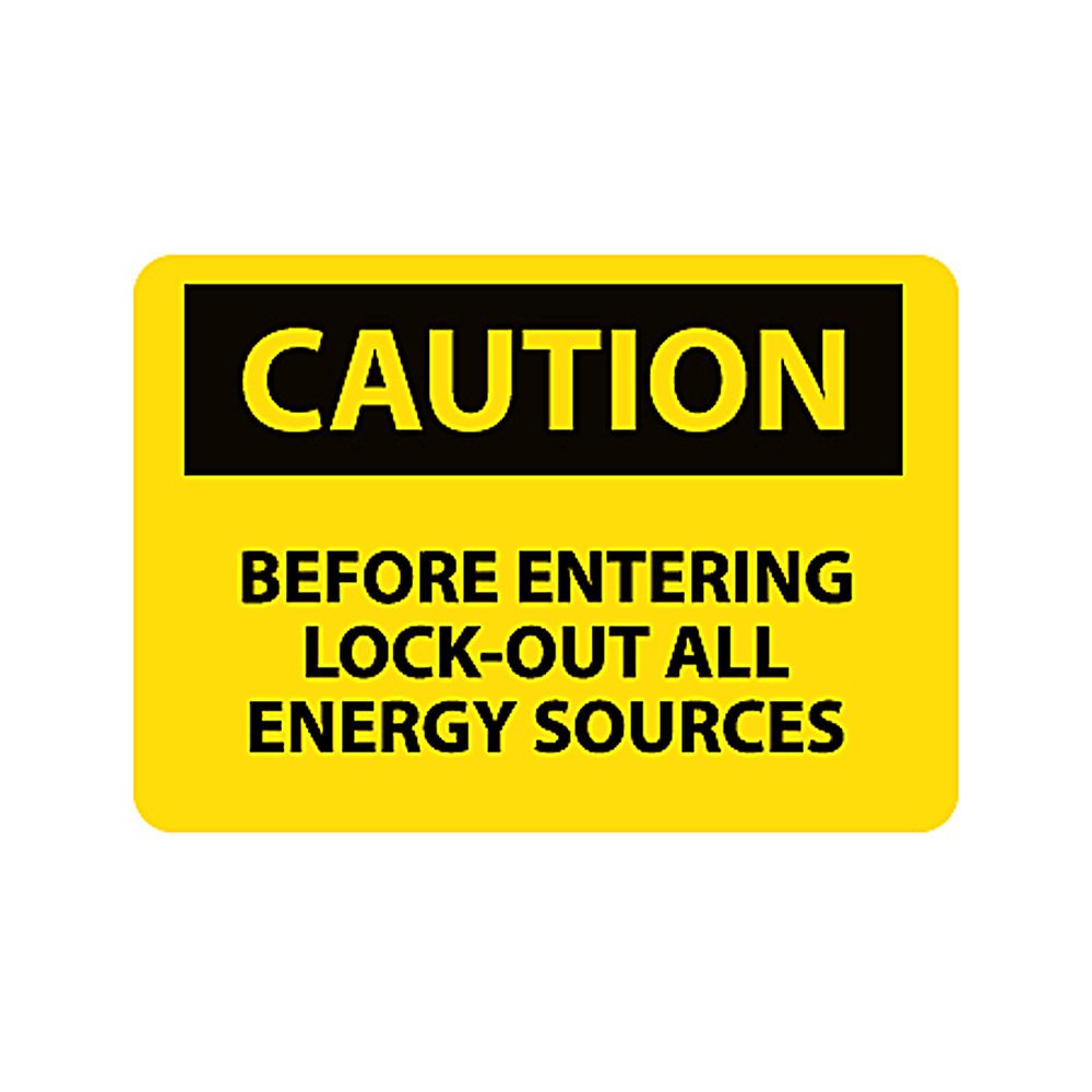 NMC OSHA sign. Header "CAUTION" and legend "BEFORE ENTERING LOCK OUT ALL ENERGY SOURCES". OSHA signs are the perfect way to alert your employees and guests when a hazard is present in your facility. Keep your facility safe, buy an OSHA regulated sign. It prevent an accident. These OSHA signs comply with OSHA 29 CFR 1910.151. Pressure sensitive vinyl 0.0045 material has pressure sensitive adhesive backing and is flexible, which allows for mounting on smooth, curved or irregular surfaces. The material is long-lasting for indoor and outdoor labeling. Good chemical resistant. Mounting sign. Maximum temperature: 178 degrees F. Black on yellow color. Measures 10-inches length by 7-inches height.