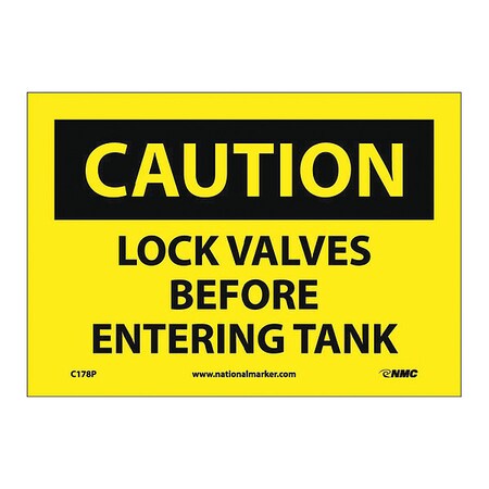 NMC C178P OSHA Sign, Legend "CAUTION - LOCK VALVES BEFORE ENTERING TANKS", 10" Length x 7" Height, Pressure Sensitive Vinyl, Black on Yellow