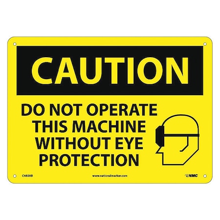 NMC C460AB OSHA Sign, Legend "CAUTION - DO NOT OPERATE THIS MACHINE WITHOUT EYE PROTECTION" with Graphic, 14" Length x 10" Height, Aluminum, Black on Yellow