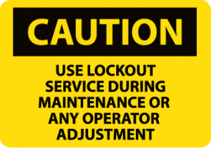 | Feature | Header "CAUTION" and legend "USE LOCKOUT SERVICE DURING MAINTENANCE OR ANY OPERATOR ADJUSTMENT" |