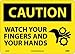 | Feature | Header "CAUTION" and legend "WATCH YOUR FINGERS AND YOUR HANDS" with graphic |
