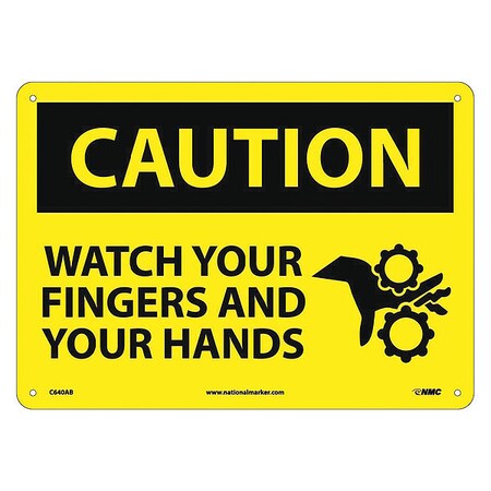 NMC C640AB OSHA Sign, Legend "CAUTION - WATCH YOUR FINGERS AND YOUR HANDS" with Graphic, 14" Length x 10" Height, Aluminum, Black on Yellow