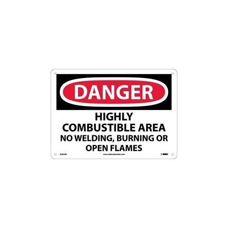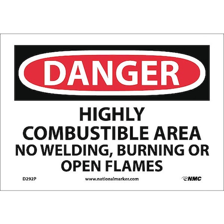 NMC D292P OSHA Sign, Legend "DANGER - HIGHLY COMBUSTIBLE AREA NO WELDING, BURNING OR OPEN FLAMES", 10" Length x 7" Height, Pressure Sensitive Adhesive Vinyl, Black/Red on White
