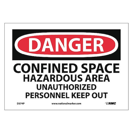 NMC D374P OSHA Sign, Legend "DANGER - CONFINED SPACE HAZARDOUS AREA UNAUTHORIZED PERSONNEL KEEP OUT", 10" Length x 7" Height, Pressure Sensitive Vinyl, Red/Black on White