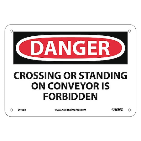 NMC D406R OSHA Sign, Legend "DANGER - CROSSING OR STANDING ON CONVEYOR IS FORBIDDEN", 10" Length x 7" Height, Rigid Plastic, Black on White