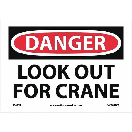 NMC D412P OSHA Sign, Legend "DANGER - LOOK OUT FOR CRANE", 10" Length x 7" Height, Pressure Sensitive Vinyl, Black/Red on White