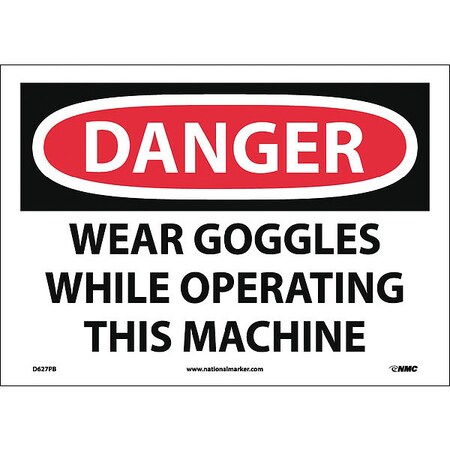 NMC D627PB OSHA Sign, Legend "DANGER - WEAR GOGGLES WHILE OPERATING THIS MACHINE", 14" Length x 10" Height, Pressure Sensitive Vinyl, Black/Red on White