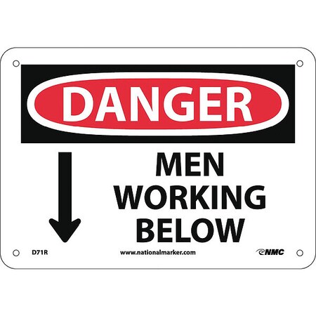 NMC D71R OSHA Sign, Legend "DANGER - MEN WORKING BELOW" with Down Arrow Graphic, 10" Length x 7" Height, Rigid Plastic, Black/Red on White