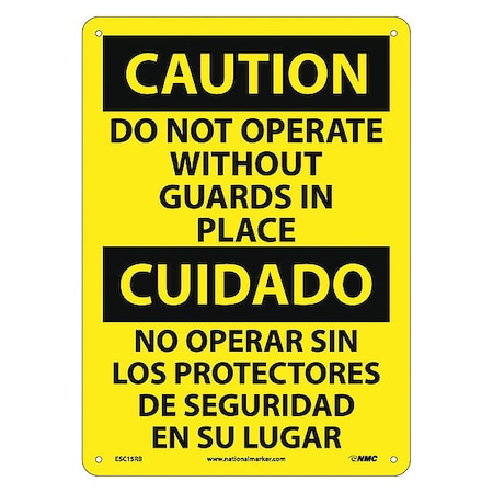 NMC ESC15RB Bilingual OSHA Sign, Legend "CAUTION - DO NOT OPERATE WITHOUT GUARDS IN PLACE", 10" Length x 14" Height, Rigid Plastic, Black on Yellow