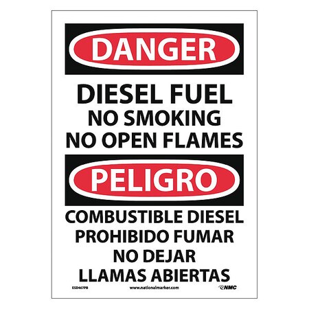 NMC ESD467PB Bilingual OSHA Sign, Legend "DANGER - DIESEL FUEL NO SMOKING NO OPEN FLAMES", 10" Length x 14" Height, Pressure Sensitive Vinyl, Black/Red on White