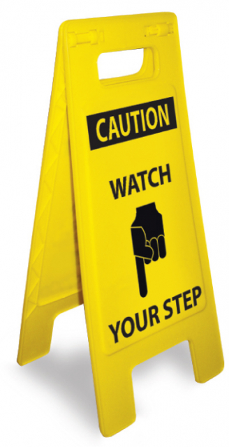 NMC heavy duty floor stand sign. Highly visible, impact-resistant signs are perfect for marking temporary hazards or displaying messages. Folds flat for space saving storage. Measures 10-3/4-inches length by 24-5/8-inches height. Header "CAUTION" and legend "WATCH YOUR STEP" with graphic.