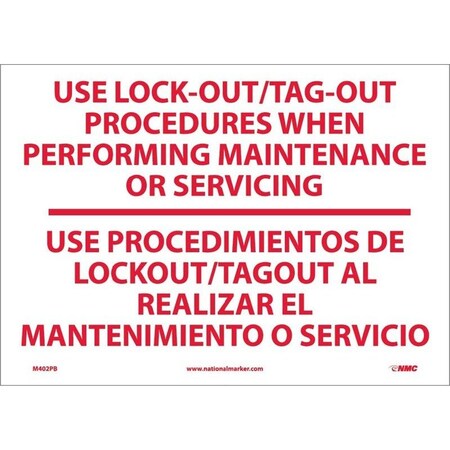 NMC M402RB Bilingual Restricted Area Sign, Legend "USE LOCK-OUT/TAG-OUT PROCEDURES WHEN PERFORMING MAINTENANCE OR SERVICING", 14" Length x 10" Width, Rigid Polystyrene Plastic, Red on White