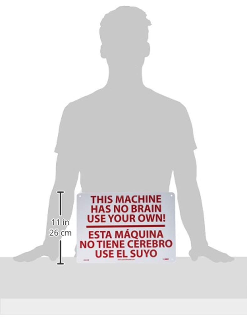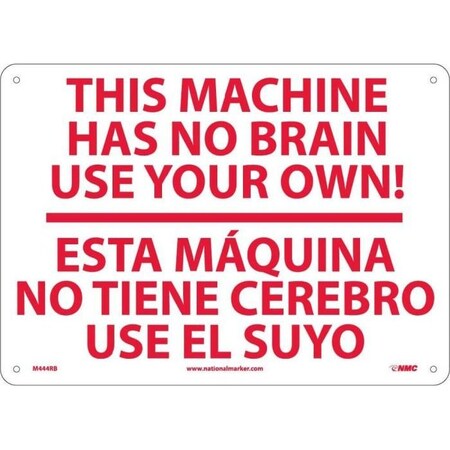NMC M444RB Bilingual Emergency and First Aid Sign, Legend "THIS MACHINE HAS NO BRAIN USE YOUR OWN!", 14" Length x 10" Height, Rigid Polystyrene Plastic, Red on White