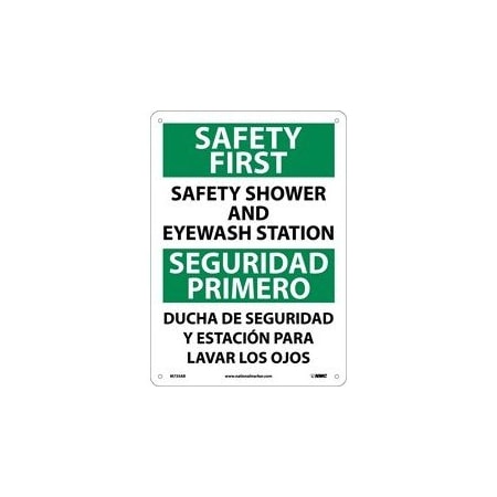 NMC M735AB Bilingual Emergency and First Aid Sign, Legend "SAFETY FIRST SAFETY SHOWER AND EYEWASH STATION", 10" Length x 14" Height, Aluminum 0.40, Green/Black on White