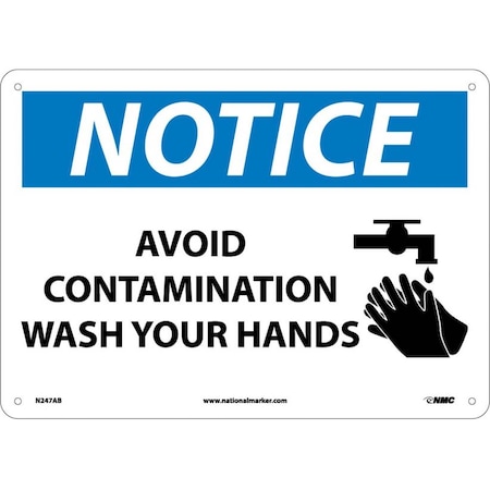 NMC N247AB OSHA Sign, Legend "NOTICE - AVOID CONTAMINATION WASH YOUR HANDS" with Graphic, 14" Length x 10" Height, Aluminum, Black/Blue on White