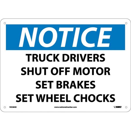 NMC N358AB OSHA Sign, Legend "NOTICE - TRUCK DRIVERS SHUT OFF MOTOR SET BRAKES SET WHEEL CHOCKS", 14" Length x 10" Height, Aluminum, Black/Blue on White