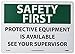 - Visibility: the sign shows the legend “SAFETY FIRST - PROTECTIVE EQUIPMENT IS AVAILABLE - SEE YOUR SUPERVISOR” in contrasting colors and clear, bold letters to ensure easy visibility in most lighting conditions and even from a distance